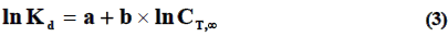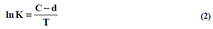 Where, K is generalized rate constant of sorption, T is absolute temperature (K); C and d are constant, characterizing corresponding entropy and enthalpy of activation of adsorption process. Equation (3) is obtained for each dependence of equilibrium coefficients of distribution of metal ions Kd from equilibrium concentration of them in solution CT,∞ at different temperatures: