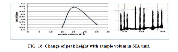 Table 15. Effect of the sample volume on peak height at Zinc (II) conc.=5 mg/l, Reaction coil length=15 cm, Dithizon conc=5 × 10-5 mol/l, Reagent volume=141.3 μl, Loading coil length=30 cm, SDS=0.01%, Flow rate=13.00 ml/min in SIA unit.