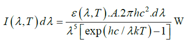 for the power emitted between the wavelengths (in meters) λ and λ + dλ from the Sun’s surface having uniform temperature T Kelvin, area A square meter and emissivity ε . Here h and k are Planck’s constant and Boltzmann’s constant, respectively. The above power between the wavelengths