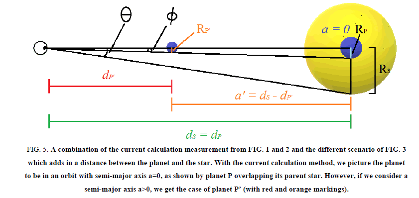 Notice as well that planet P cannot actually exist in this arrangement, since it has a nonexistent semi-major axis. It does not orbit its parent star; rather, it is within the star. The position and size of planet P is simply what we observe in our calculations when we neglect the dimension of depth. When we add in the third dimension, planet P is found where planet P’ is shown in the diagram; it is the same planet, but smaller and at some distance a from its parent star [2].