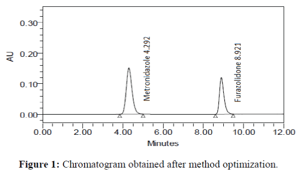 Elena and Milea [13] have developed an isocratic HPLC procedure for quantitative determination of metronidazole and furazolidone. The chromatographic separation was done using Kromasil C18 (250 mm × 4.6 mm; 5 μm particle size) analytical column with mobile phase consisted of methanol and 0.1% phosphoric acid (20:80 v/v), run at flow rate of 1 mL/ min. The detection was at 317 nm. A stability-indicating HPLC method for the analysis of metronidazole, furazolidone and its degradation products was developed by Kumar et al. [14]. Separation of metronidazole and furazolidone from its degradation products was achieved by using a mobile phase consisting of acetonitrile, methanol and phosphate buffer (10:40:50 v/v/v) through an XTerra C18 column (150 mm × 4.6 mm; 5 μm particle size) at a flow rate of 1 mL/min with UV-detection at 270 nm.