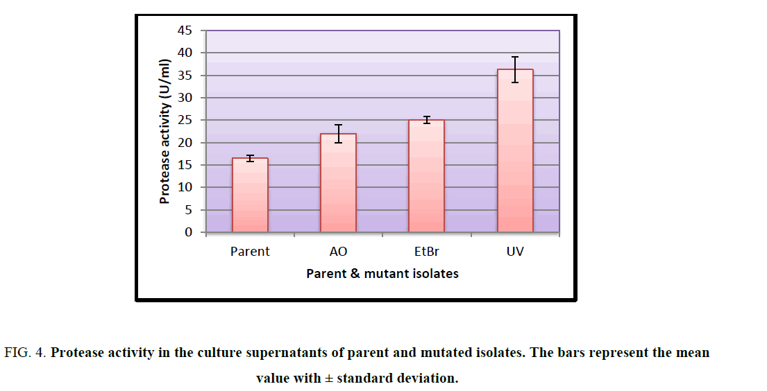 Figure 4: Protease activity in the culture supernatants of parent and mutated isolates. The bars represent the mean value with ± standard deviation.